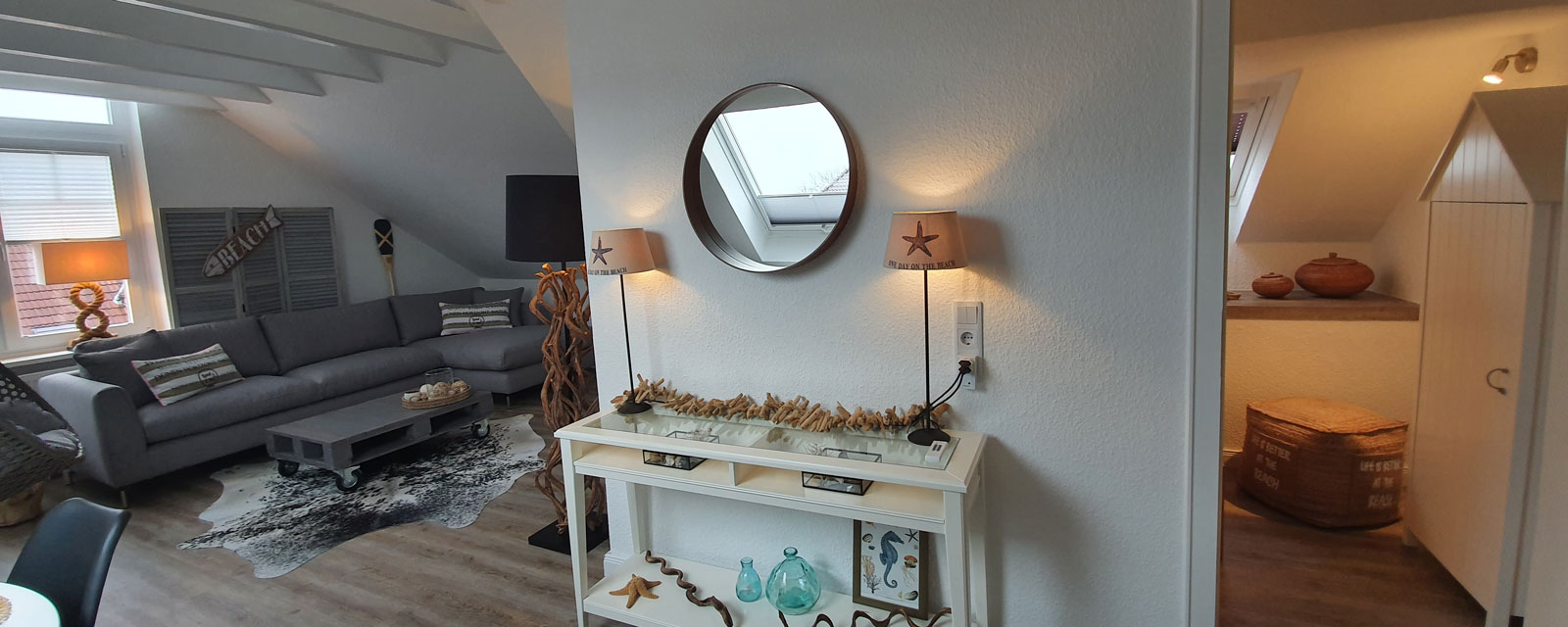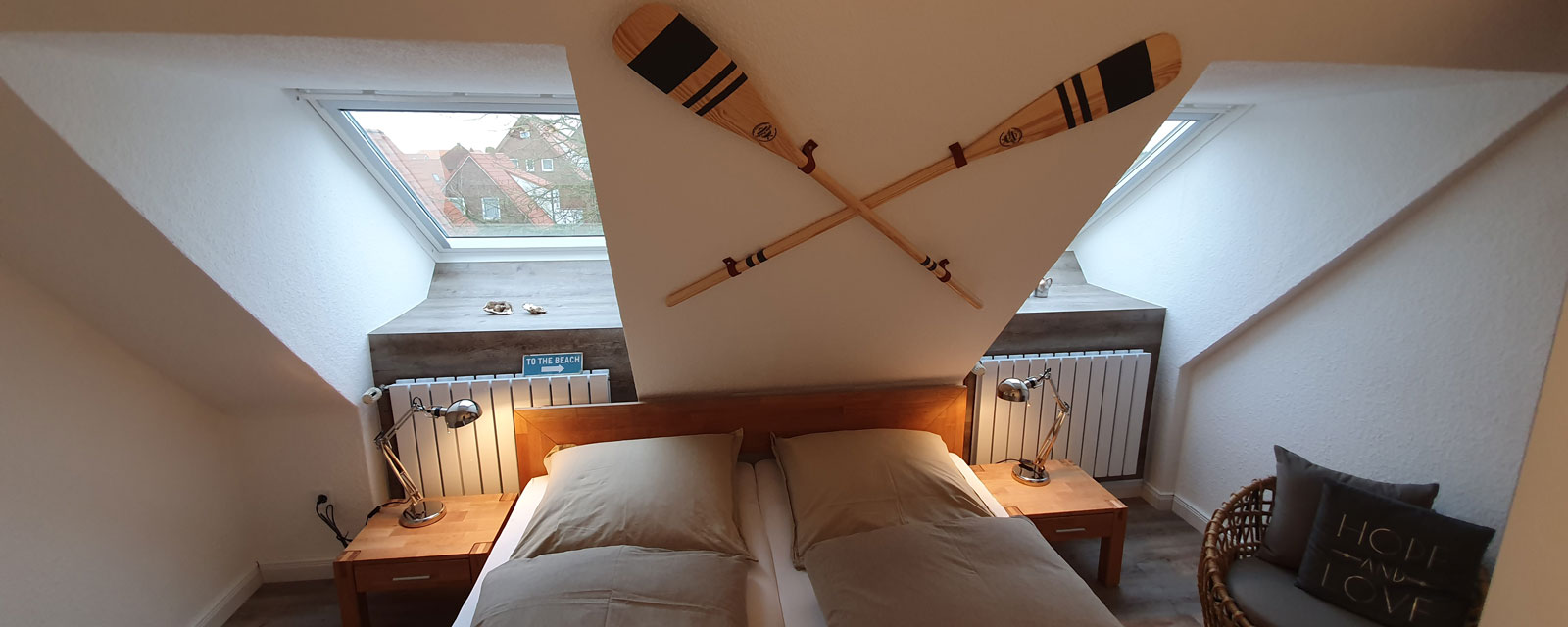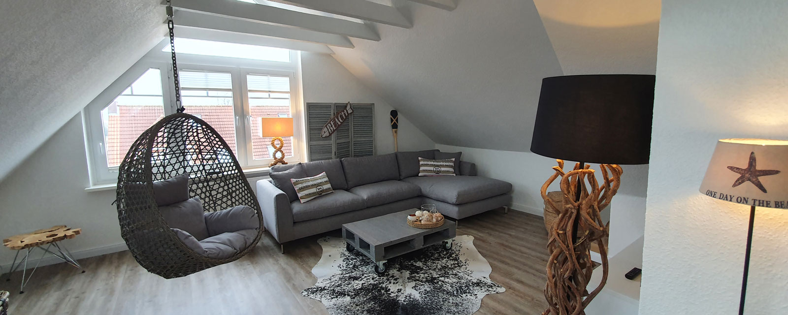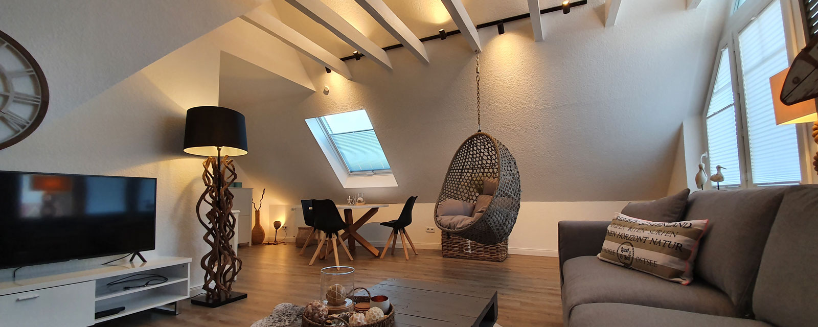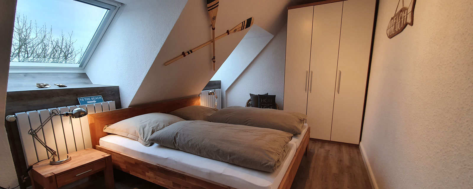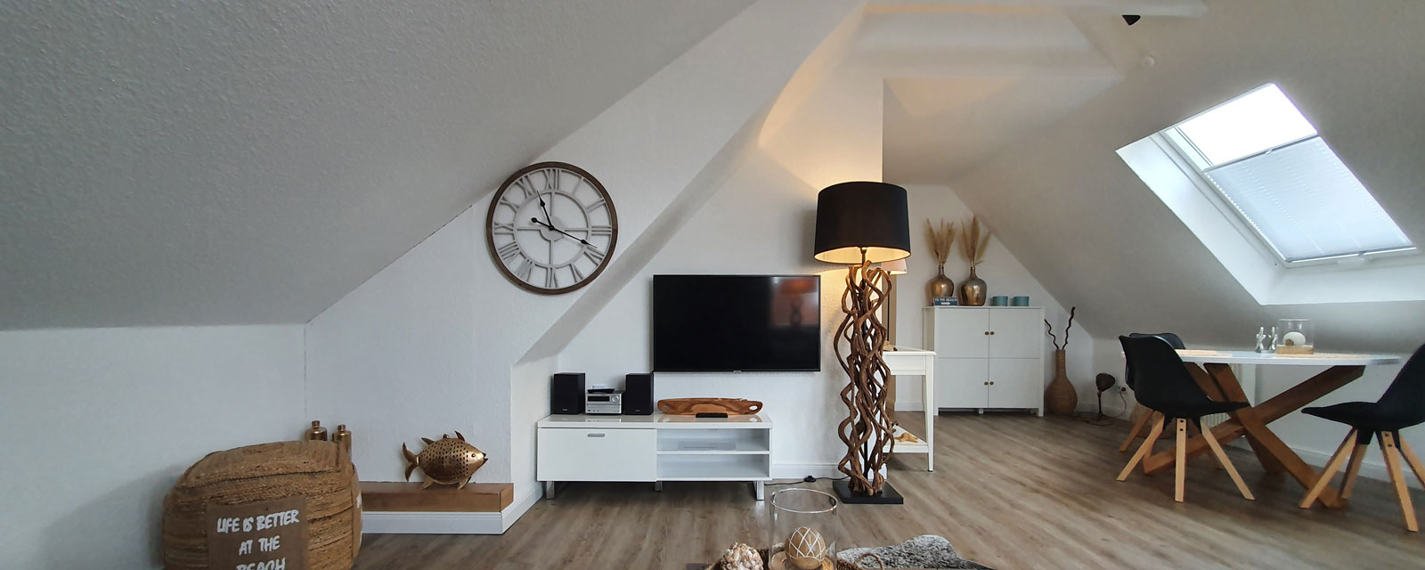 Das Appartement Bekassine verfügt über 65m2, ist für maximal 3 Personen ausgelegt und liegt im Dachgeschoss des Hauses.
